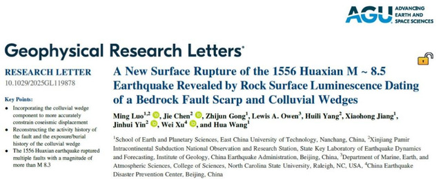 近日,欧冠联赛网站地球与行星科学学院罗明博士作为第一作者,在国际权威地球科学期刊《Geophysical Research Letters》上发表了题为《A New Surface Rupture of the 1556 Huaxian M ~ 8.5 Earthquake Revealed by Rock Surface Luminescence Dating of a Bedrock Fault Scarp and Colluvial Wedges》的研究成果。该研究以欧冠联赛网站为第一署名单位,联合中国地震局地质研究所(通讯作者陈杰研究员)、北卡罗莱纳州立大学和中国震防中心等国内外高校及科研院所合作完成。