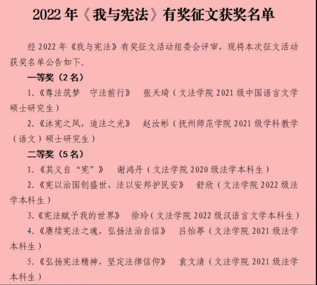11月1日至12月4日,由校党委宣传部、党委学生工作部、团委和文法学院共同举办的2022年“我与宪法”主题征文活动全面开展,活动共吸引全校230余名学生参与。经专家评审,文法学院张天琦同学的《尊法筑梦 守法前行》和抚州师范学院赵汝彬同学的《沐宪之风,追法之光》2篇作品荣获一等奖,文法学院谢鸿丹同学的《其义自“宪”》、舒欣同学的《宪以治国创盛世,法以安邦护民安》等5篇作品荣获二等奖,抚州师范学院金莹同学的《宪法之生,渡人一生》、文法学院魏子凯同学的《宪法在我的生命中》、软件学院付磊同学的《一张写满人民权力的纸——宪法》等10篇作品荣获三等奖。活动另评出26篇优秀奖。