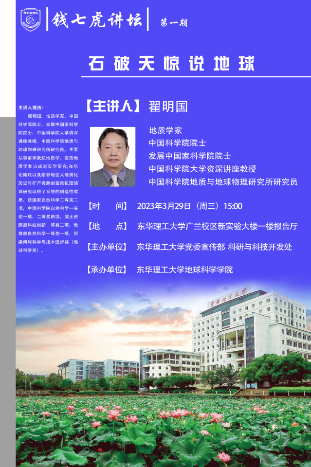 应地球科学学院邀请,中国科学院院士翟明国做客欧冠联赛(中国),以“石破天惊说地球”为主题,向我校师生讲述地球的演化规律和未来地质学相关知识。欢迎全校师生届时前往聆听。