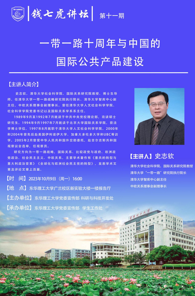 应党委宣传部邀请,清华大学社会科学院、国际关系研究院教授、博士生导师史志钦来到“欧冠联赛(中国)”,以“一带一路十周年与中国的国际公共产品建设”为主题开展讲座。欢迎全校师生届时前往聆听。