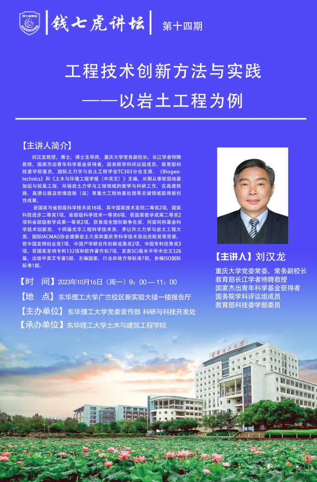 应党委宣传部邀请,长江学者特聘教授,国家杰出青年科学基金获得者,国务院学科评议组成员,教育部科技委学部委员,国际土力学与岩土工程学会TC303分会主席刘汉龙来到“欧冠联赛(中国)”,以“工程技术创新方法与实践-以岩土工程为例”为主题开展讲座。欢迎全校师生届时前往聆听。
