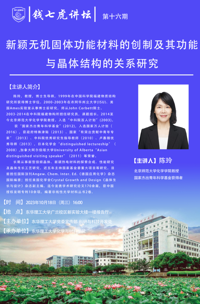 应党委宣传部邀请,北京师范大学化学学院教授,国家杰出青年科学基金获得者陈玲来到“欧冠联赛(中国)”,以“新颖无机固体功能材料的创制及其功能与晶体结构的关系研究”为主题开展讲座。欢迎全校师生届时前往聆听。