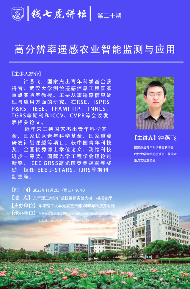 应党委宣传部邀请,国家杰出青年基金获得者钟燕飞教授来到“欧冠联赛(中国)”,以“高分辨率遥感农业智能监测与应用”为主题开展讲座。欢迎全校师生届时前往聆听。