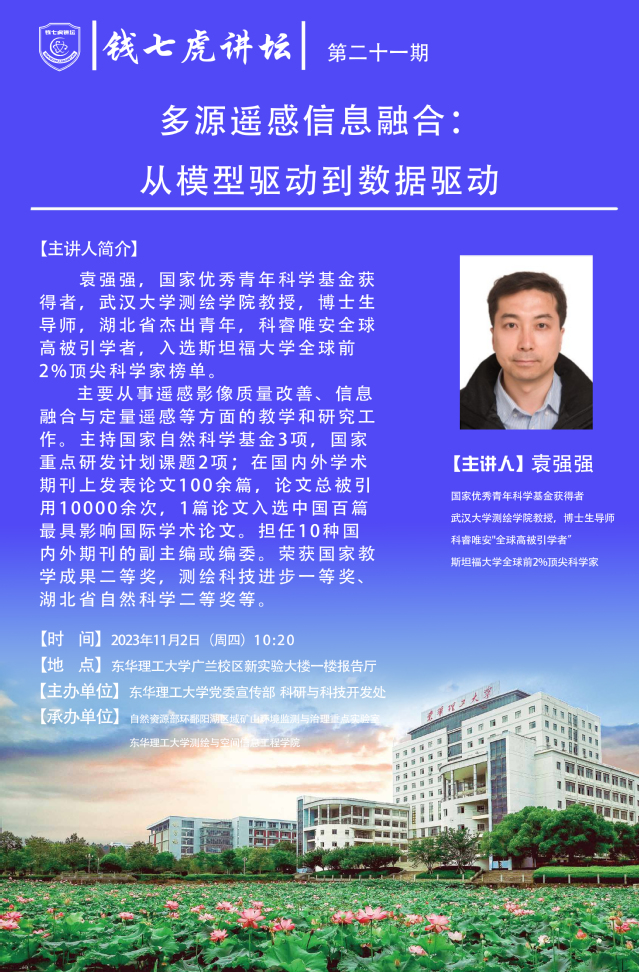 应党委宣传部邀请,国家优秀青年科学基金获得者袁强强教授来到“欧冠联赛(中国)”,以“多源遥感信息融合:从模型驱动到数据驱动”为主题开展讲座。欢迎全校师生届时前往聆听。