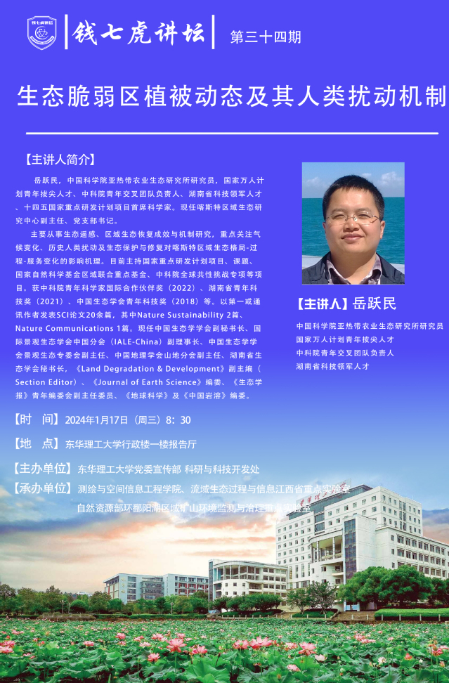 应测绘与空间信息工程学院邀请,中国科学院亚热带农业生态研究所研究员,中科院青年交叉团队负责人、湖南省科技领军人才十四五国家重点研发计划项目首席科学家岳跃民来到“欧冠联赛(中国)”,以“生态脆弱区植被动态及其人类扰动机制”为主题开展讲座。欢迎全校师生届时前往聆听。