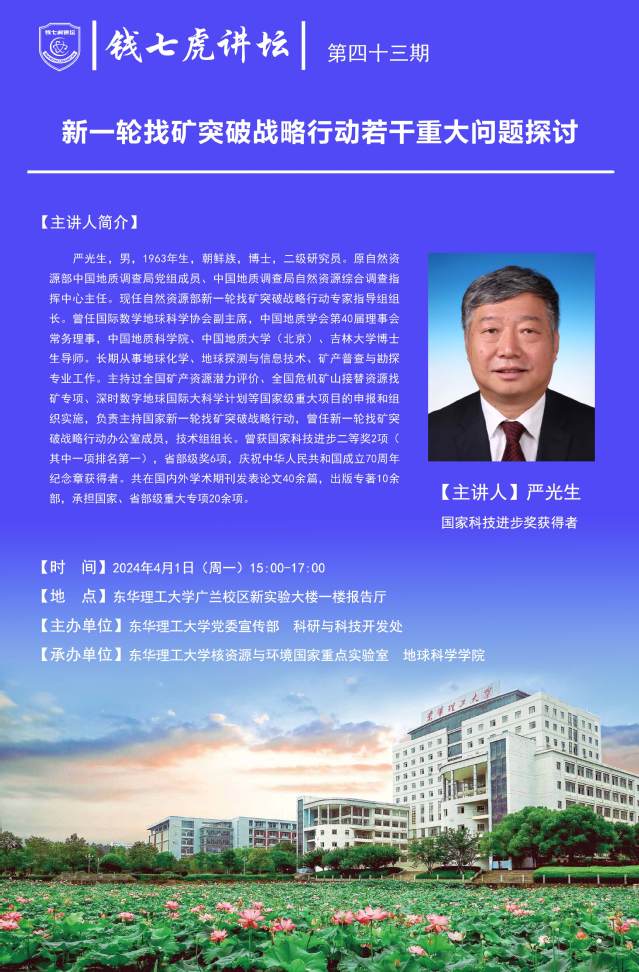 应欧冠联赛网站核资源与环境国家重点实验室与地球科学学院邀请,自然资源部新一轮找矿突破战略行动专家預导组组长严光生来到“欧冠联赛(中国)”,以“新一轮找矿突破战略行动若干重大问题探讨”为主题开展讲座。欢迎全校师生届时前往聆听。