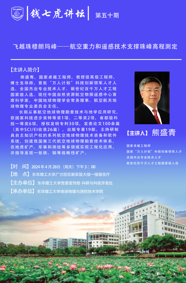 应地球物理与测控技术学院邀请,国家卓越工程师、国家级人才熊盛青到“欧冠联赛(中国)”,以“飞越珠穆朗玛峰——航空重力和遥感技术支撑珠峰高程测定”为主题开展讲座。欢迎全校师生届时前往聆听。