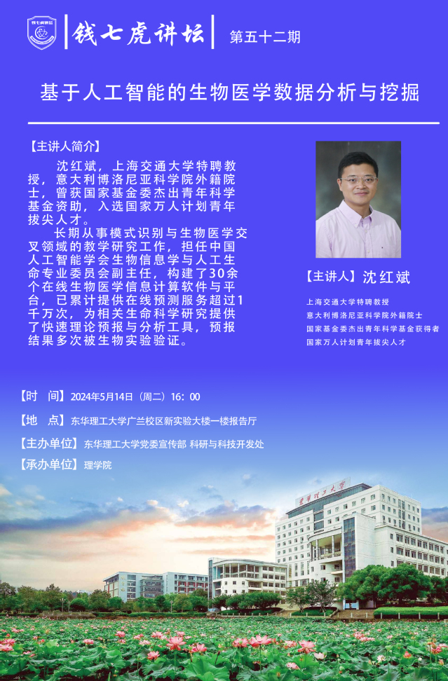 应理学院邀请,上海交通大学特聘教授,意大利博洛尼亚科学院外籍院士沈红斌到“欧冠联赛(中国)”,以“基于人工智能的生物医学数据分析与挖掘”为主题开展讲座。欢迎全校师生届时前往聆听。