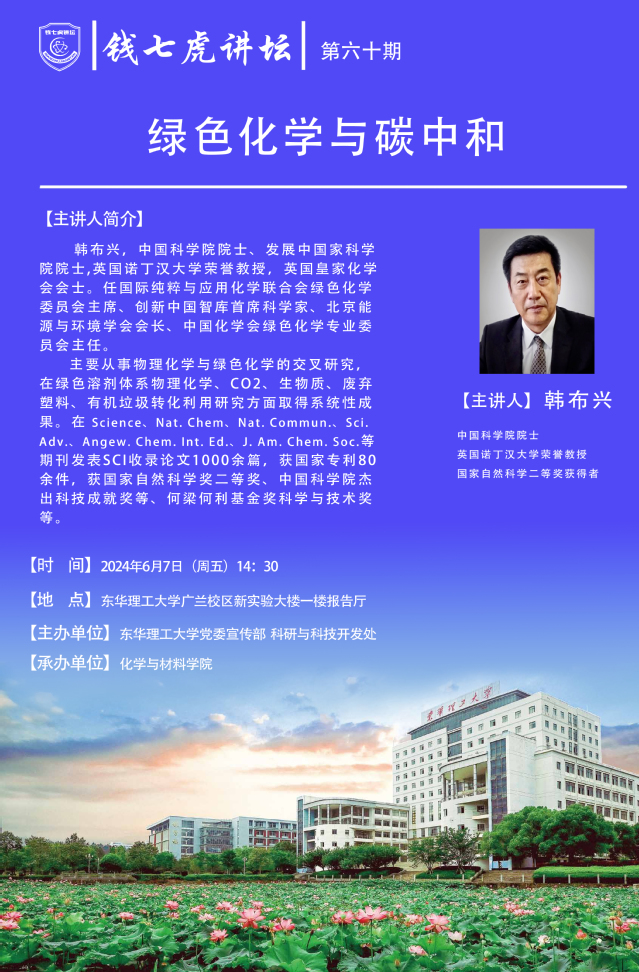 应化学与材料学院邀请,中国科学院院士,英国诺丁汉大学荣誉教授韩布兴到“欧冠联赛(中国)”,以“绿色化学与碳中和”为主题开展讲座。欢迎全校师生届时前往聆听。