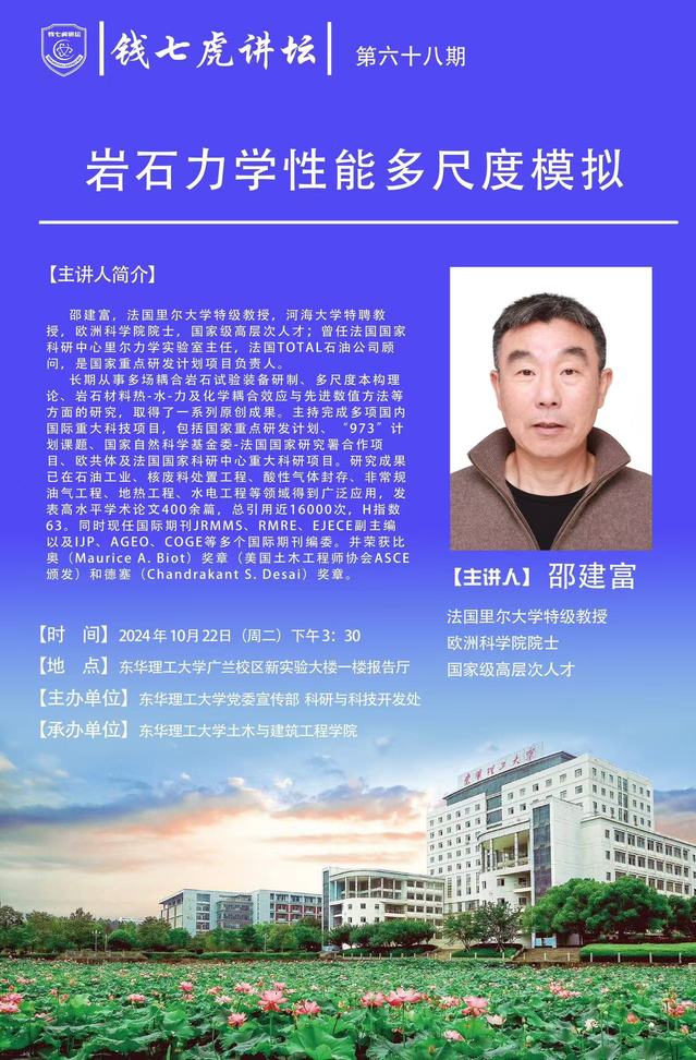 邵建富,法国里尔大学特级教授,河海大学特聘教授,欧洲科学院院士,国家级高层次人才;曾任法国国家科研中心里尔力学实验室主任,法国TOTAL石油公司顾问,是国家重点研发计划项目负责人。