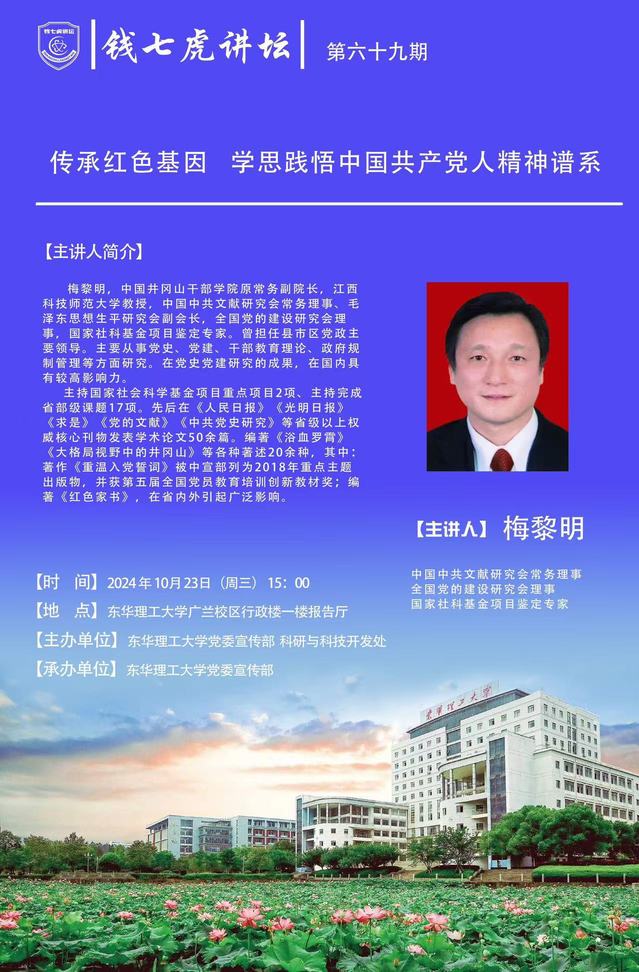 应欧冠联赛网站党委宣传部邀请,江西科技师范大学教授,中国中共文献研究会常务理事、毛泽东思想生平研究会副会长,全国党的建设研究会理事,国家社科基金项目鉴定专家梅黎明到“欧冠联赛(中国)”,以“传承红色基因 学思践悟中国共产党人精神谱系”为主题开展讲座。欢迎全校师生届时前往聆听。