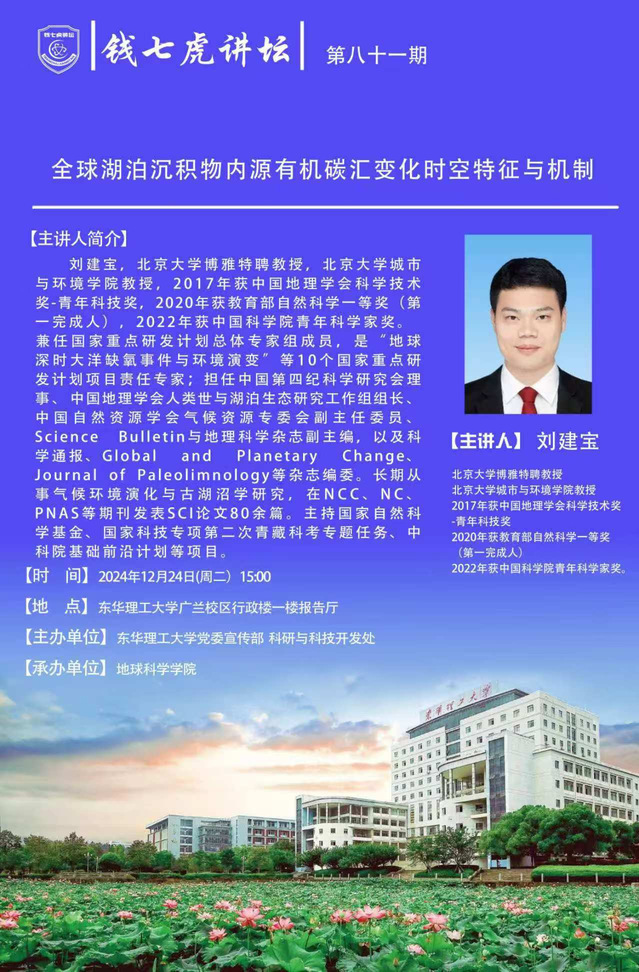应地球科学学院邀请,北京大学博雅特聘教授,北京大学城市与环境学院教授刘建宝到“欧冠联赛(中国)”以“全球湖泊沉积物内源有机碳汇变化时空特征与机制”为主题开展讲座。欢迎全校师生届时前往聆听。