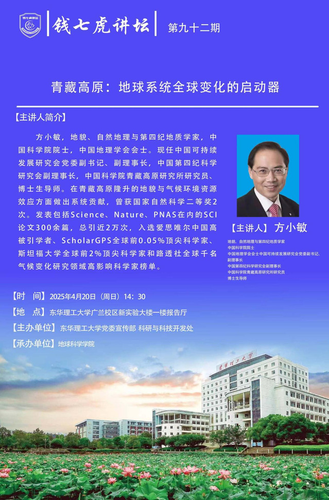 应地球科学学院邀请,中国科学院院士,中国地理学会会士方小敏到“欧冠联赛(中国)”,以“青藏高原:地球系统全球变化的启动器”为主题开展讲座。欢迎全校师生届时前往聆听。