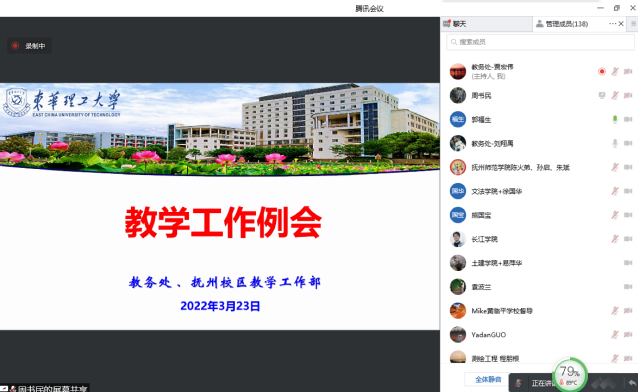 为确保疫情防控期间线上教学有序运行,教学质量与线下教学同质等效,学校于3月23日上午通过腾讯会议平台召开线上教学工作专题会议。校党委常委、副校长郭福生,各二级教学单位负责人,教务处、高等教育研究与评估中心、抚州校区教学工作部、学工部(处)、校教学督导组相关人员参加会议。