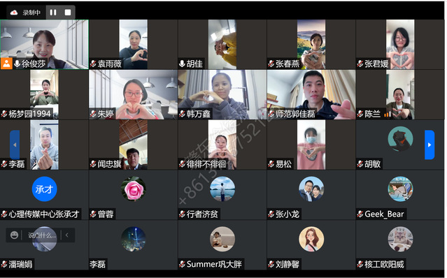 基于前期对师生心理状况调研结果,本次团体辅导活动以情绪疏通和压力缓解为主,采用线上形式进行,项目涵盖自身状态自查(3W自检法)、问题沟通、放松训练等。活动以雨点变奏曲导入热身,紧接着帮助大家梳理情绪、检验思维和调节情绪,最后以腹式呼吸训练与正念动作训练结尾。团辅结束后,老师和心理委员们纷纷表示自己身心得到了彻底放松,释放了压力,同时也学到了情绪调节的实用方法与技巧。